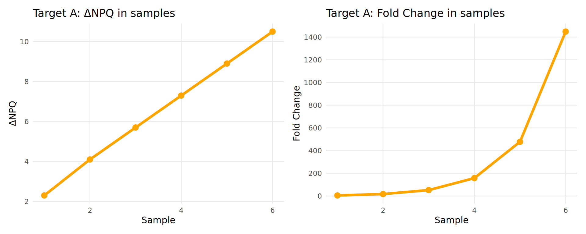 While NPQ values cannot be directly compared between targets, you can calculate ratios between targets and compare these ratios across individuals or groups. As with single-target NPQ values, these ratios are not absolute quantities — only the fold changes between ratios are meaningful.