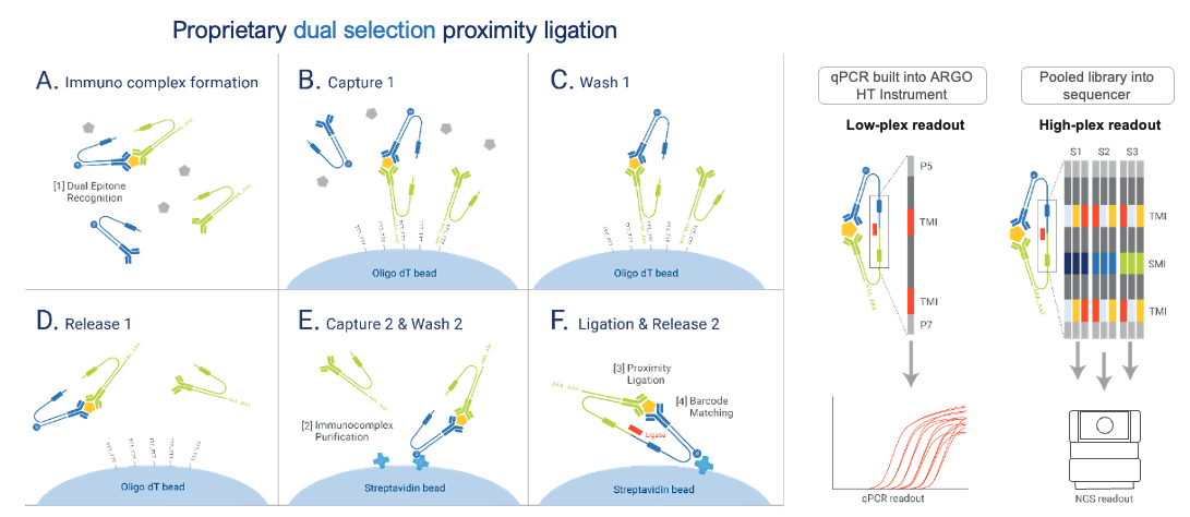 The NULISAseq platform uses a proprietary dual selection proximity ligation approach to obtain high sensitivity and high signal-to-noise ratio for multiplexed protein detection:
